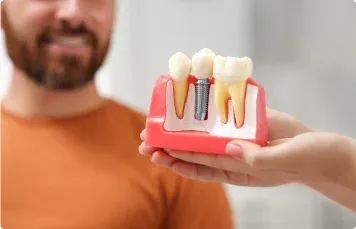 Implants are synthetic structures that are placed in the area of the tooth normally occupied by the root. Implants are anchored to the jawbone or metal framework on the bone and act as a foundation for an artificial tooth or permanent bridge. In some cases, implants can be used to attach dentures.